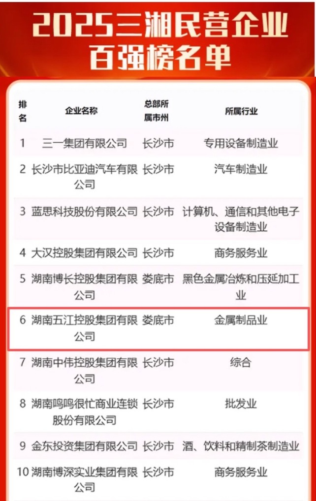 2025年12月18日,2025三湘民營(yíng)企業(yè)百?gòu)?qiáng)榜新聞發(fā)布會(huì)在長(zhǎng)沙舉行,湖南省政協(xié)副主席、省工商聯(lián)主席張健出席,省委統(tǒng)戰(zhàn)部副部長(zhǎng)、省工商聯(lián)黨組書記胡建新主持發(fā)布2025三湘民營(yíng)企業(yè)百?gòu)?qiáng)榜單。湖南五江控股集團(tuán)有限公司榮登2025三湘民企百?gòu)?qiáng)榜第6名,連續(xù)5年躋身三湘民企百?gòu)?qiáng)榜前六強(qiáng)。